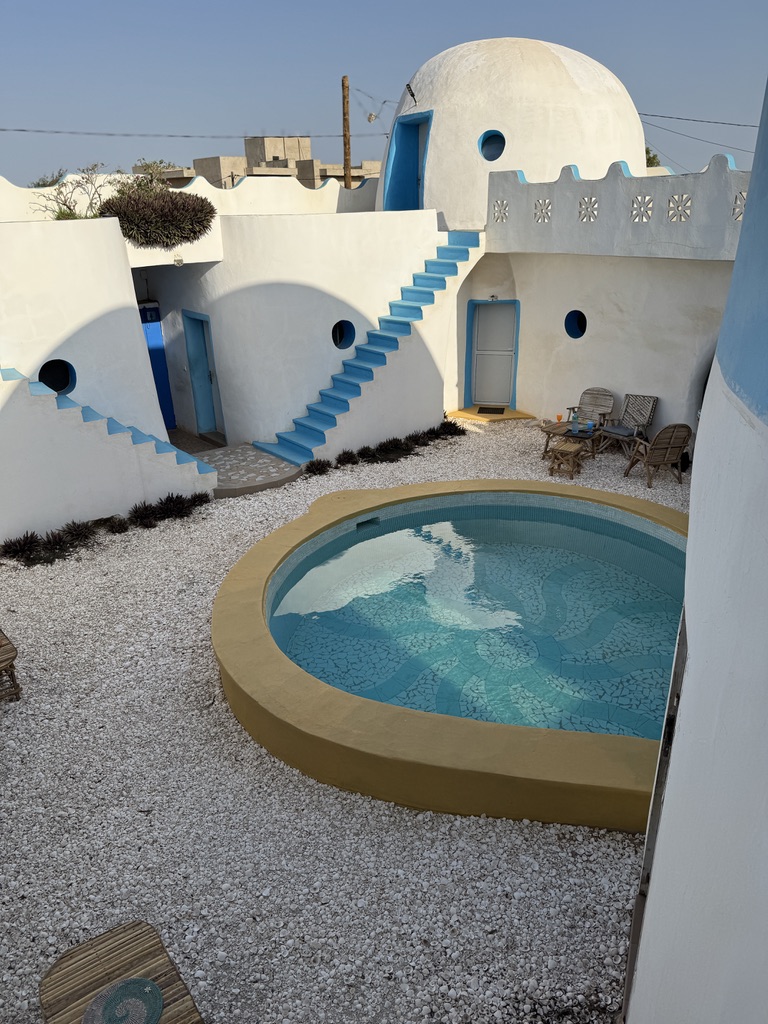 Mais au-delà de sa conception technique, cette maison est un chef-d’œuvre visuel. Les courbes des murs, le blanc éclatant, les touches de bleu… tout respire la simplicité et la beauté. Chaque pièce te fait sentir chez toi, que ce soit les chambres aux lits arrondis, la salle de bain ornée de mosaïques, ou les espaces communs baignés de lumière.